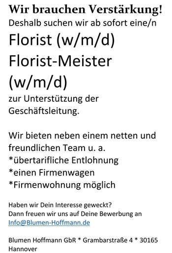 Wenn Sie Interesse an einer etablierten Floristik-Fachstelle mit Potenzial haben, freuen wir uns auf Ihre Kontaktaufnahme! E-Mail: gudrun2@zahnarzt-flechsig.de
